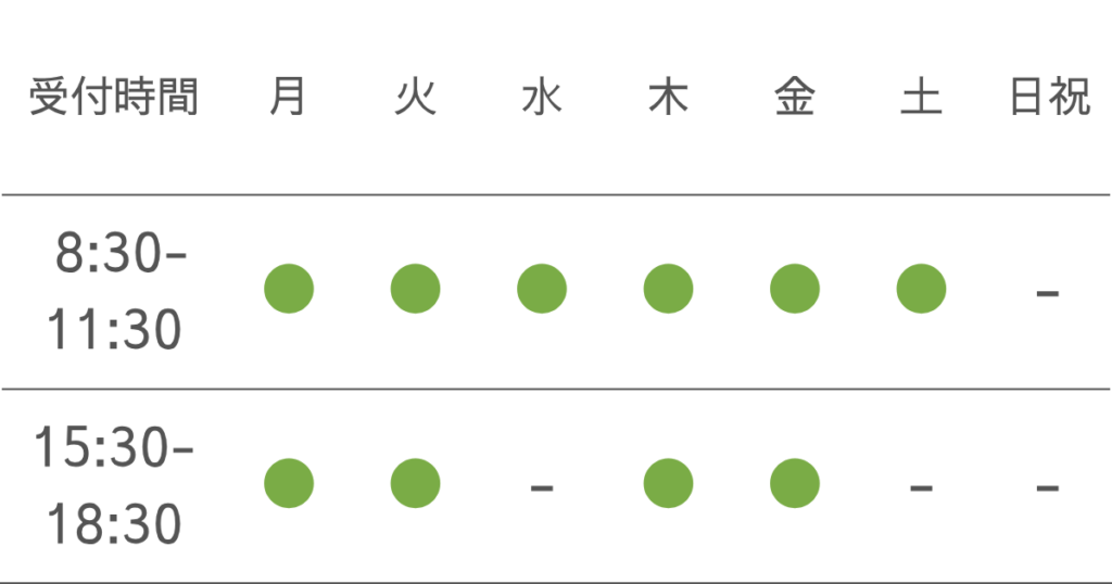 お仕事帰りに寄りやすいように遅めの受付終了時間です。初めての方やお久しぶりの方は、18時30分までにお越しください。